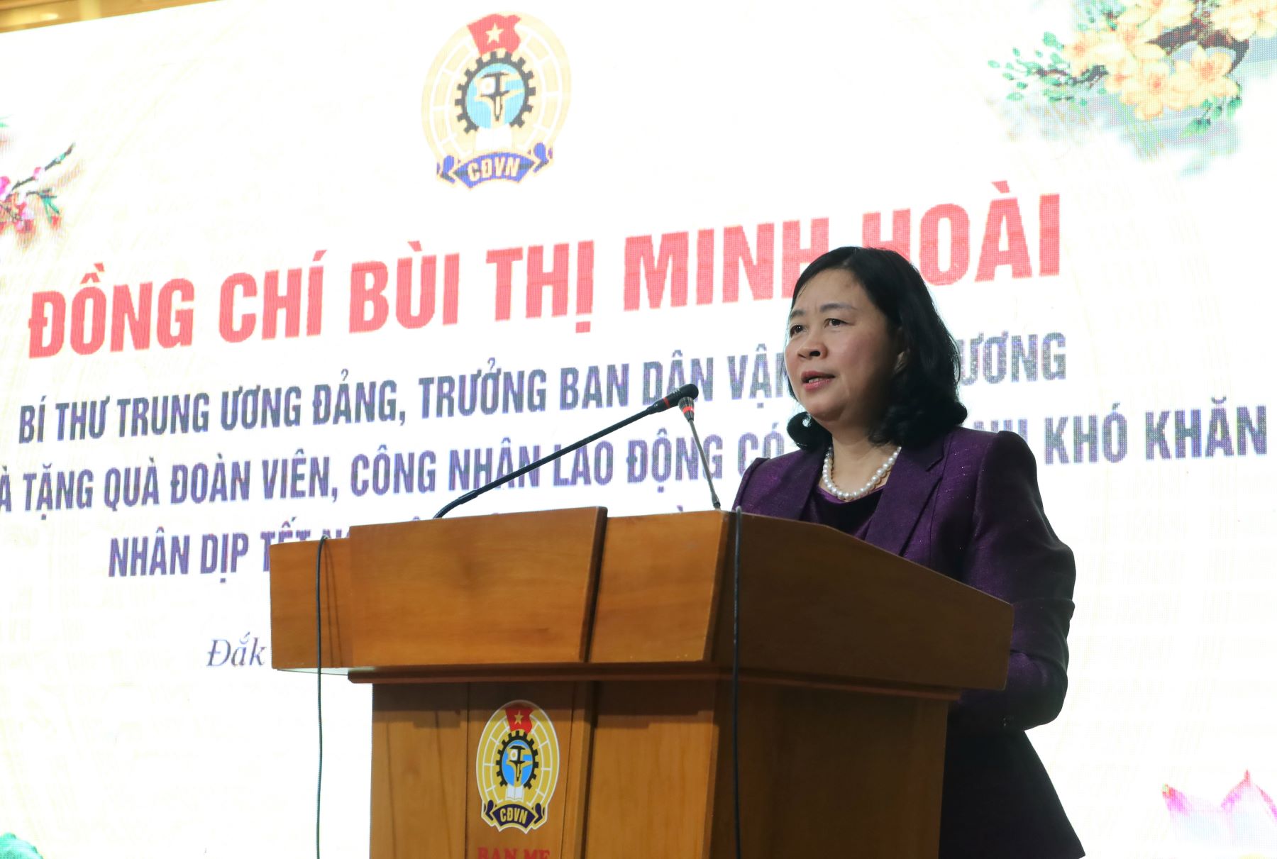 Phát biểu tại chương trình, Bí thư Trung ương Đảng, Trưởng Ban Dân vận Trung ương Bùi Thị Minh Hoài ghi nhận và đánh giá cao sự nỗ lực của công đoàn các cấp trên địa bàn tỉnh Đắk Lắk trong thời gian qua đã tổ chức hiệu quả nhiều hoạt động nâng cao phúc lợi cho đoàn viên; tạo sức lan tỏa mạnh mẽ, góp phần động viên, khích lệ đoàn viên, người lao động có hoàn cảnh khó khăn hăng hái lao động sản xuất, ổn định cuộc sống.