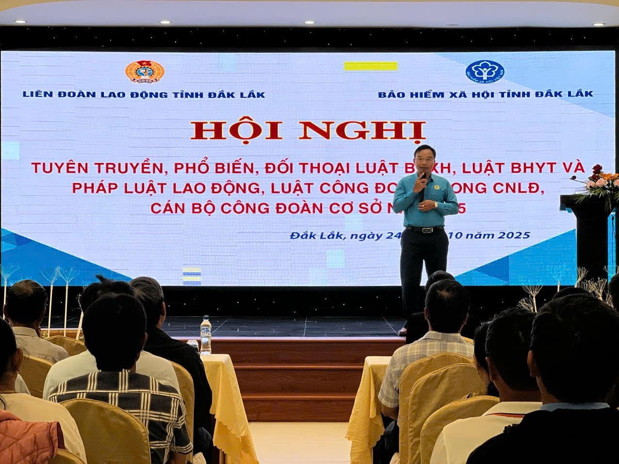 Chiều ngày 24 tháng 10 năm 2025 - Tại Phường Tuy Hoà, tỉnh Đắk Lắk. Liên đoàn Lao động tỉnh phối hợp cùng Bảo hiểm xã hội tỉnh đã tổ chức Hội nghị đối thoại, tuyên truyền, phổ biến Luật BHXH, Luật BHYT, pháp luật lao động, Luật Công đoàn trong đoàn viên, NLĐ năm 2025.