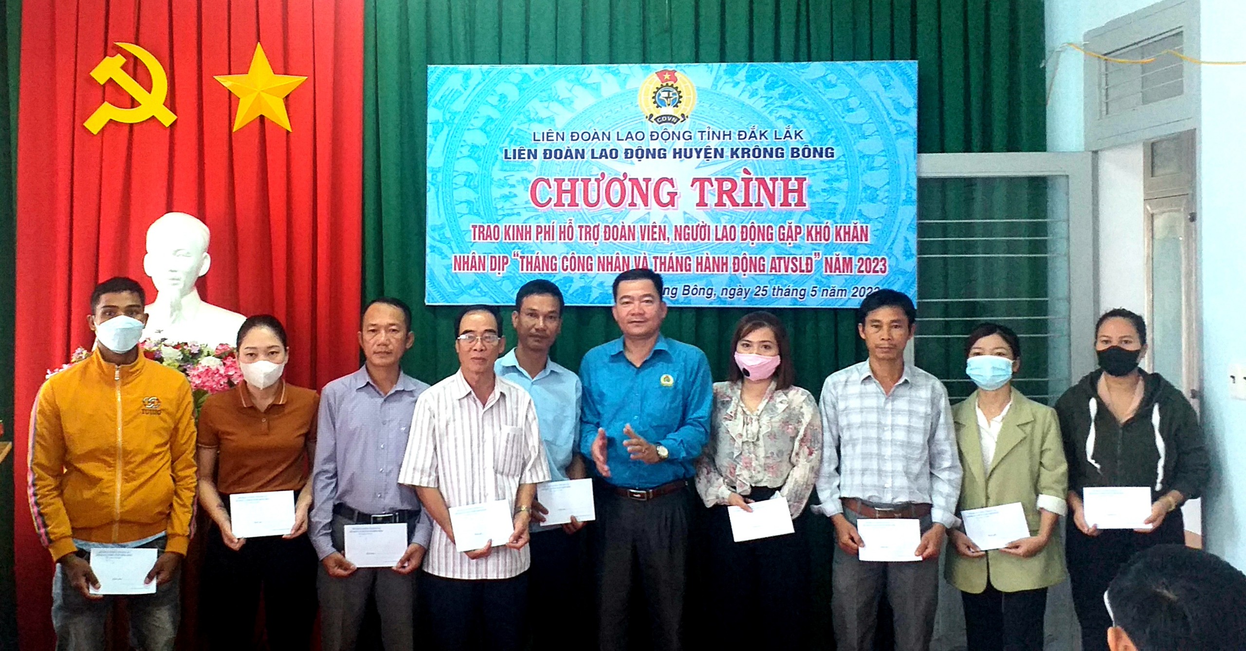 Trong Tháng công nhân, LĐLĐ tỉnh hỗ trợ 20 suất quà 20 triệu đồng (1.000.000đ/suất), LĐLĐ huyện 35 suất 17.5 triệu đồng (500.000đ/suất) cho đoàn viên có hoàn cảnh khó khăn; xét hỗ trợ đoàn viên khó khăn về nhà ở 01 nhà mái ấm công đoàn 40 triệu đồng. Các CĐCS thăm, tặng 65 suất quà trị giá 22,4 triệu đồng cho đoàn viên khó khăn, bệnh hiểm nghèo; kết nạp mới được 12 đoàn viên công đoàn....