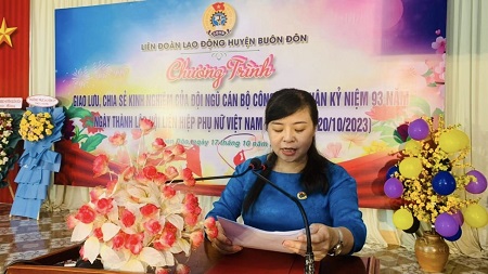Ngày 17/10, Liên đoàn Lao động huyện Buôn Đôn tổ chức Chương trình giao lưu, chia sẻ kinh nghiệm trong đội ngũ cán bộ Công đoàn nhân kỷ niệm 93 năm Ngày Thành lập Hội Liên hiệp Phụ nữ Việt Nam (20/10/1930 - 20/10/2023) và 13 năm ngày Phụ nữ Việt Nam (20/10/2010 - 20/10/2023).