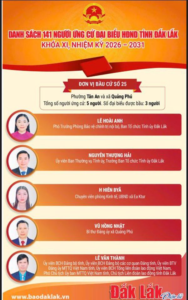 Tiểu sử tóm tắt các ứng cử viên đại biểu HĐND tỉnh Đắk Lắk khóa XI, nhiệm kỳ 2026-2031: Đơn vị bầu cử số 25